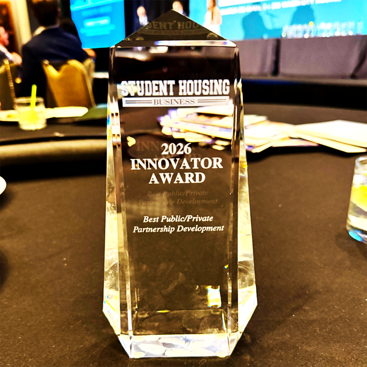 Jeremy Doss, Senior Vice President of Development, shared, “This recognition comes from the Student Housing Business Innovator Awards and is particularly meaningful given the level of competition. The project was selected from a large pool of recently completed on-campus P3 developments from across the country and evaluated by a panel of judges representing both the public and private sectors.